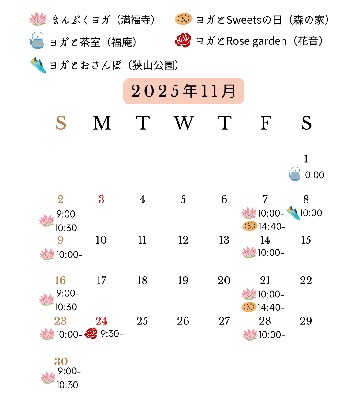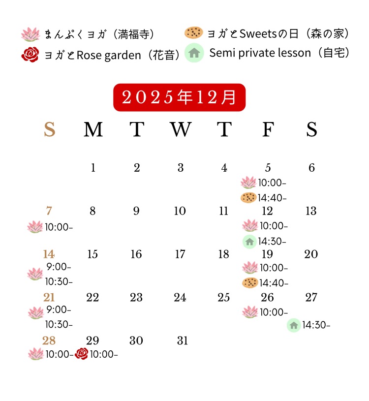 現在開催中のヨガクラスの情報をこちらにまとめています。 予約リンク先はこちら。 ◇国分寺市 戸倉 満福寺 ◇小平市 津田町 森の家 ◇国分寺市 スタジオ花音 ◇福生市 茶室福庵 ◇立川市 パークヨガ … 続きを読む 【月間スケジュール】