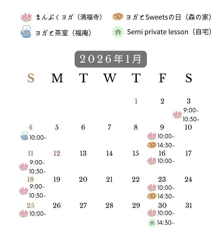 現在開催中のヨガクラスの情報をこちらにまとめています。 予約リンク先はこちら。 ◇国分寺市 戸倉 満福寺 ◇小平市 津田町 森の家 ◇国分寺市 スタジオ花音 ◇福生市 茶室福庵 ◇立川市 パークヨガ … 続きを読む 【月間スケジュール】